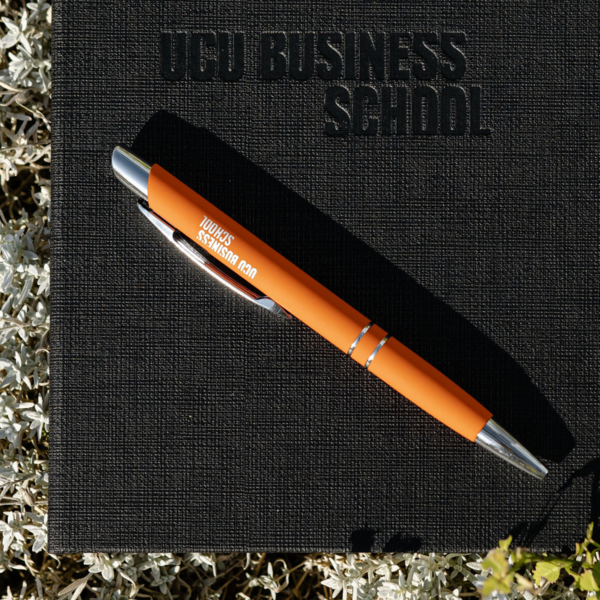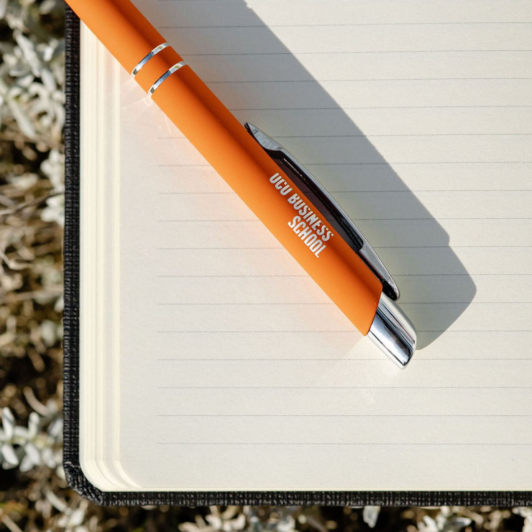 Помаранчева металева ручка з логотипом – яскравий аксесуар, що додасть кольору вашим робочим будням. У поєднанні з блокнотом стане незамінним елементом офісного набору.