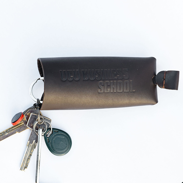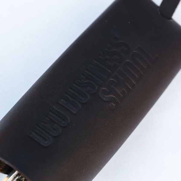 Стильна ключниця з натуральної шкіри з тисненим логотипом UCU Business School, зібрана на міцних заклепках.